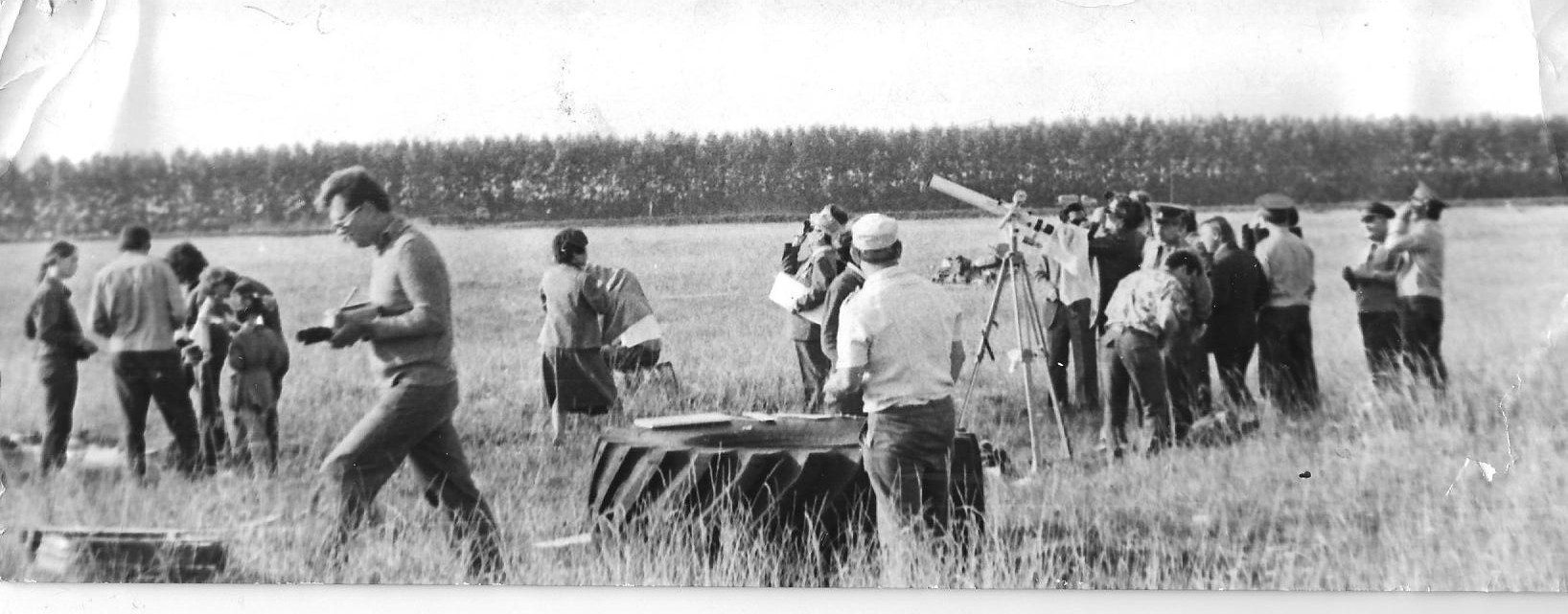Оселилися в гуртожитку й вирушили на околиці, щоб обрати місце майбутнього спостереження. У чистому полі (не повірите!) нас чекала несподіванка, ми побачили величезну шину, виготовлену на Шинному заводі у Дніпрі (тоді ще Дніпропетровську). Це була, наче частинка дому поруч. Біля неї ми й організували нашу локацію і «застовпили» місце для спостереження.