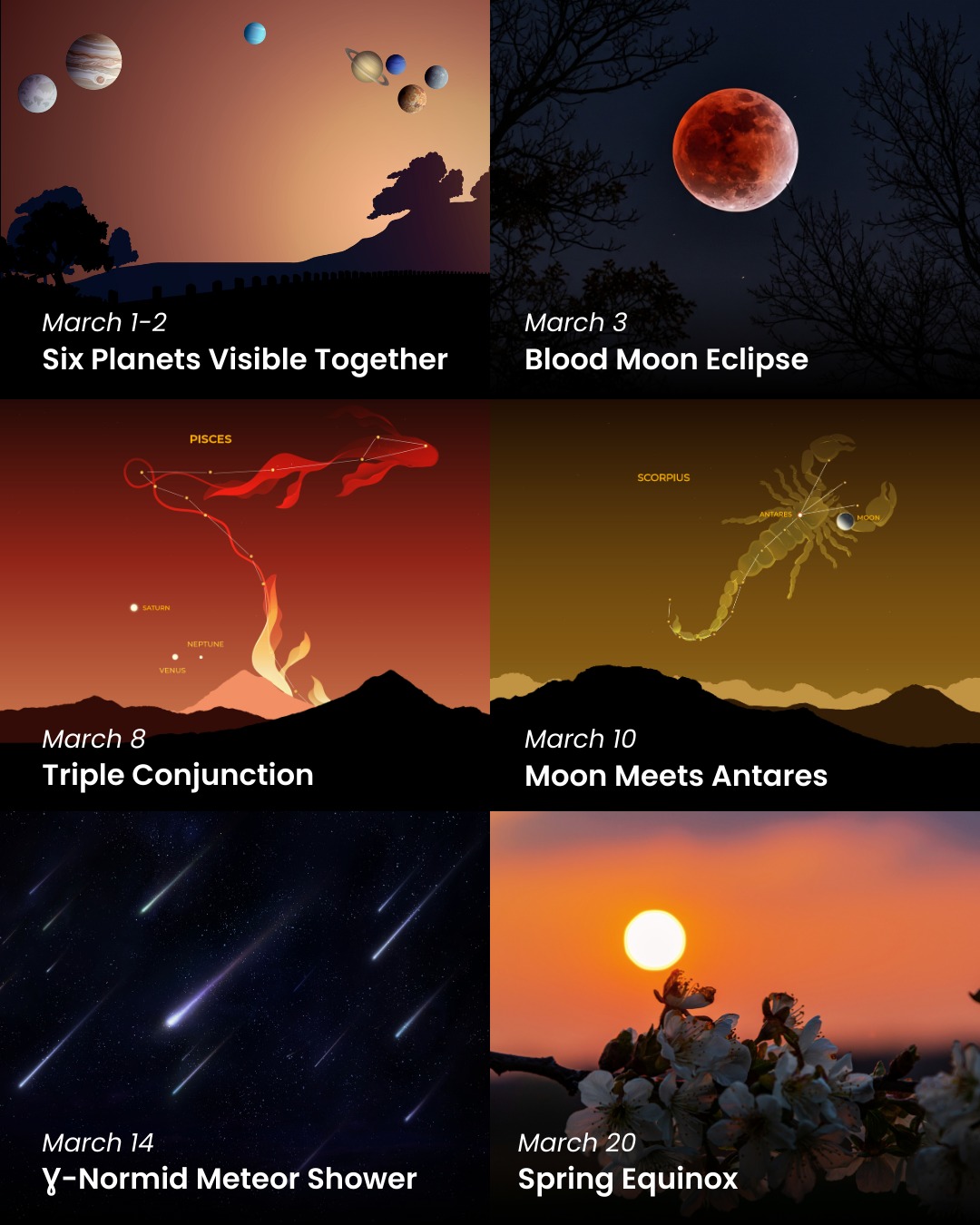 - 20 березня — сполучення Місяця (3 %) з Венерою (-3,9m). Точний час сполучення – 09:44, але оптимальний момент для спостережень — одразу після заходу Сонця.